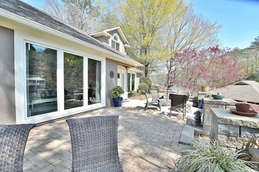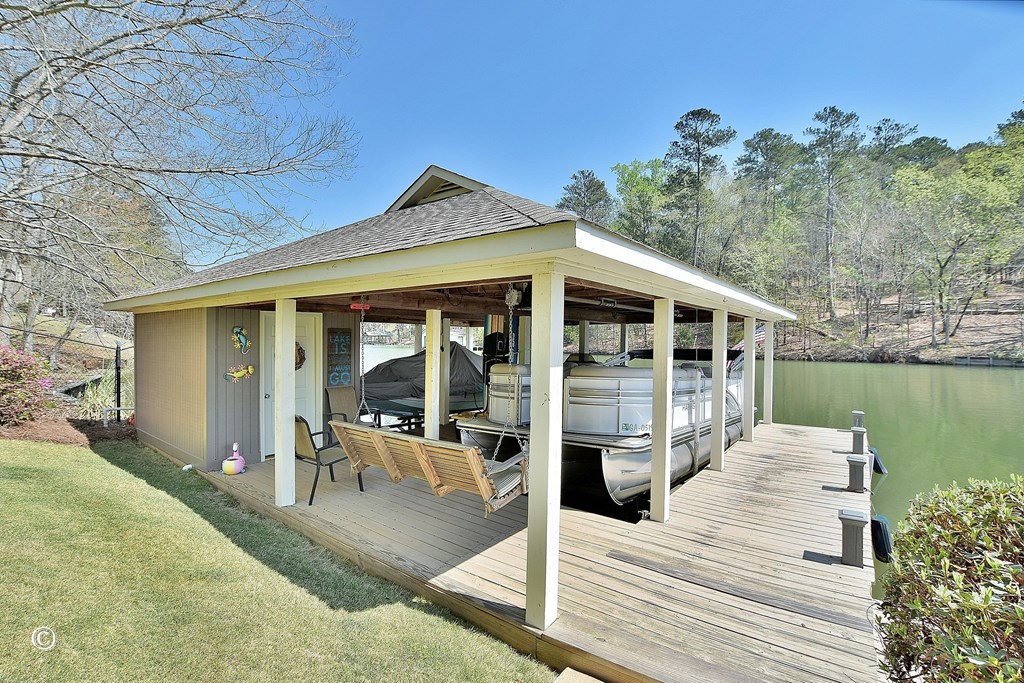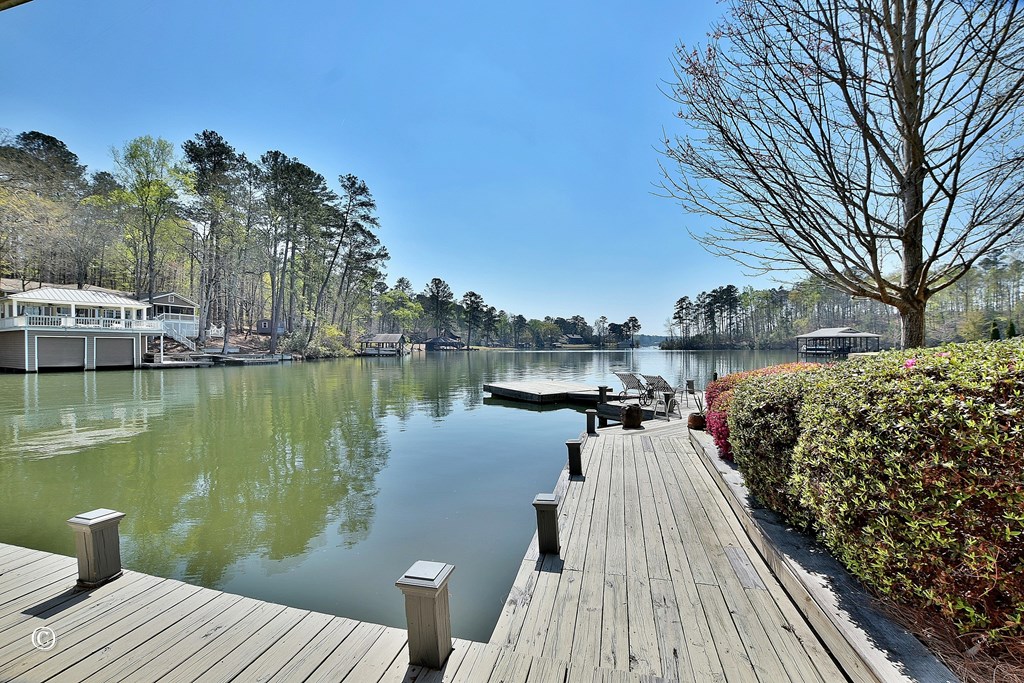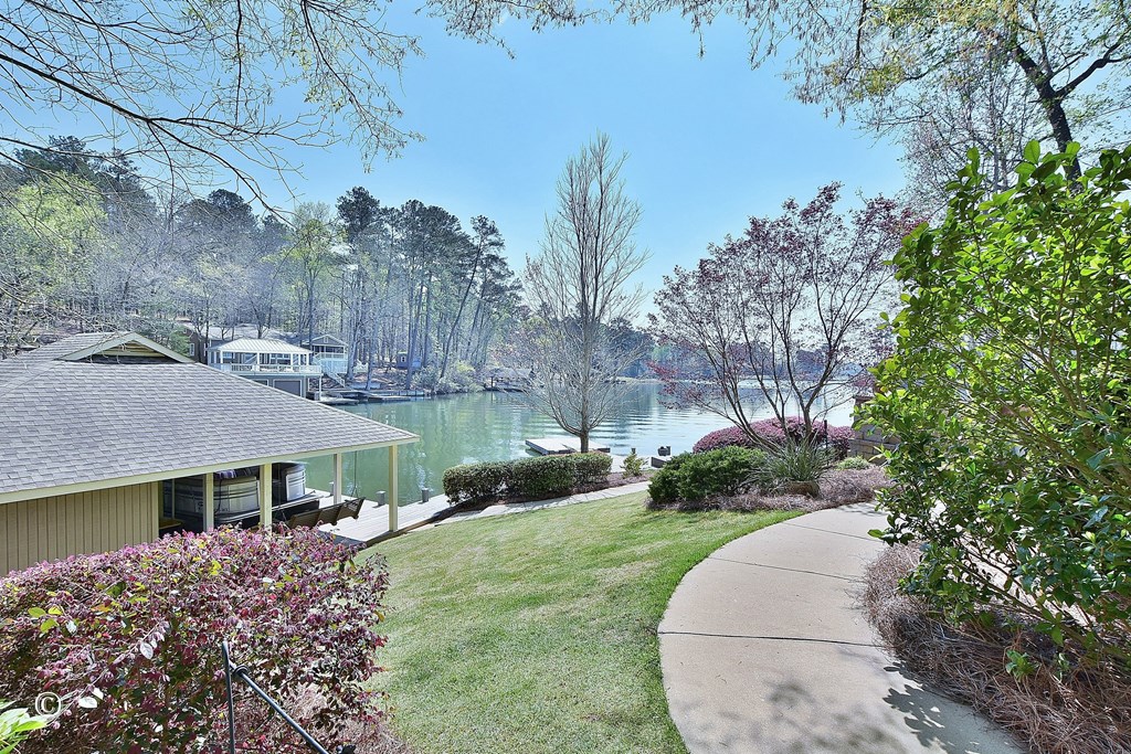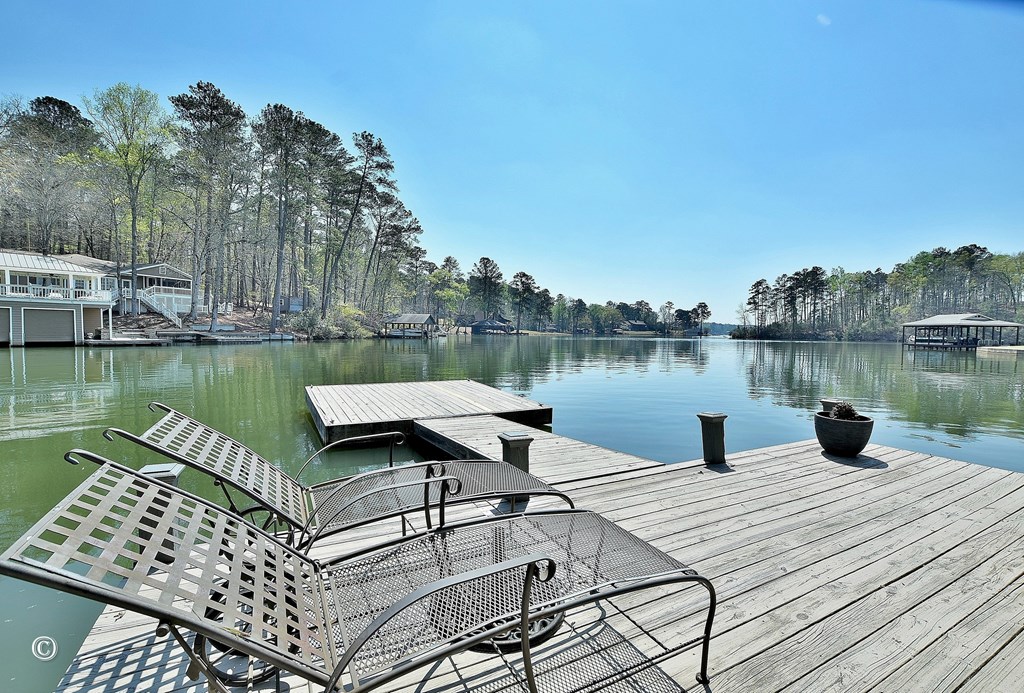 Welcome to your dream Lake Harding waterfront home—where breathtaking views and exceptional design come together in the heart of the lake on deep water. This beautifully maintained 3-bedroom, 2.5-bath lake house offers 2,628 sq ft of thoughtfully designed living space with comfort, function, and unforgettable views throughout. Step into the foyer overlooking a stunning living room with soaring beamed ceilings, exposed brick accents, oversized windows, and incredible lake views. The updated kitchen features a quartz island, granite countertops, farmhouse sink, under-cabinet lighting, high-end GE Caf appliances, and a pantry for added convenience. The upper level includes two bedrooms and an updated bath, while the spacious primary suite offers panoramic water views and a luxurious bath with glass shower, double vanity, and walk-in closet with sliding barn door. Additional living spaces include a separate den and sunroom—perfect for relaxing or entertaining. Outdoor living is unmatched with expansive decking, patio, hot tub, and an outdoor shower designed for easy lake days. The boathouse includes two boat lifts and a jet ski lift, along with a floating dock for effortless access to the water. A sprinkler system, two outbuildings, and generous storage add everyday practicality to this exceptional lake property. Located in one of the most desirable areas of Lake Harding with deep water and big-water enjoyment, this home is ideal for both full-time living and weekend escapes.